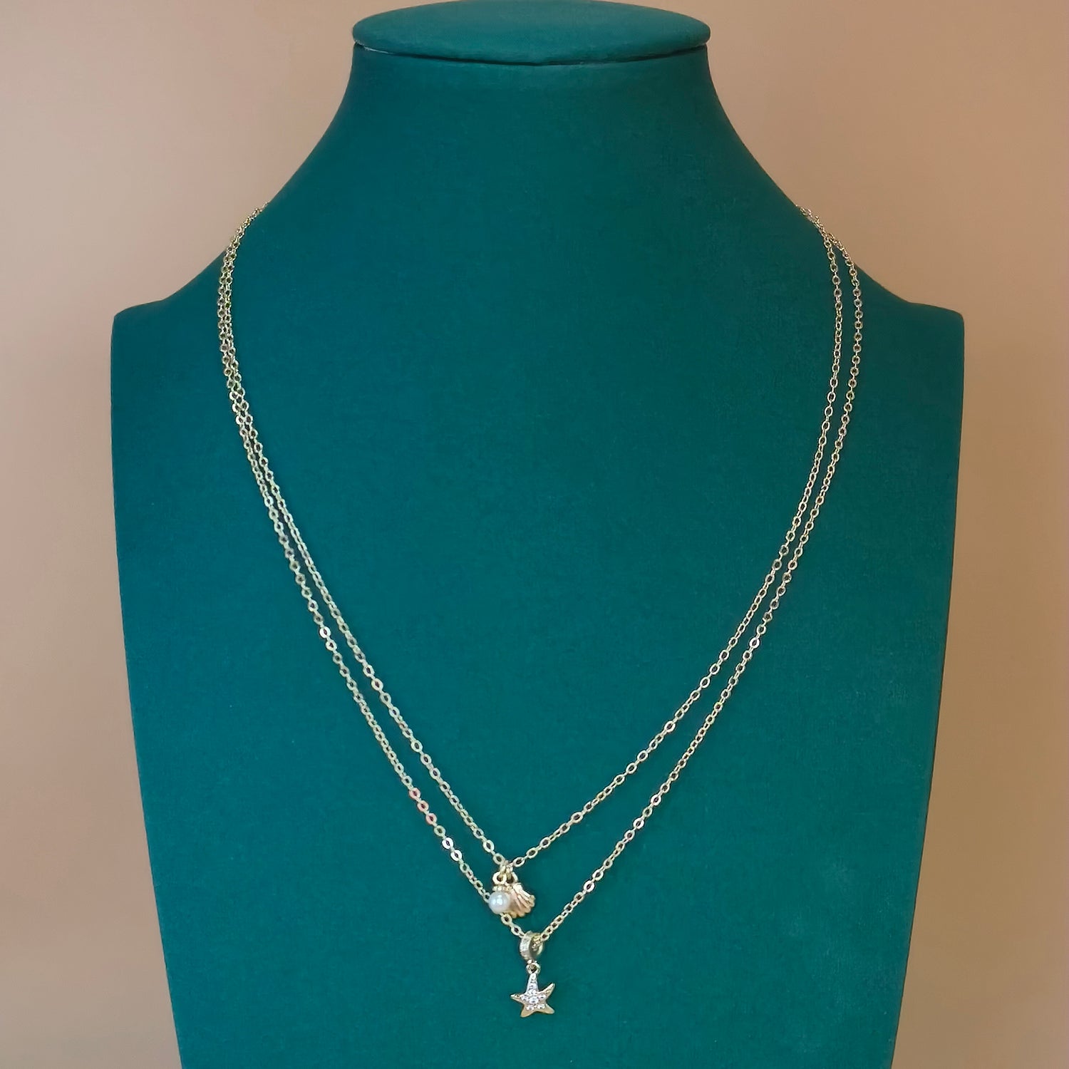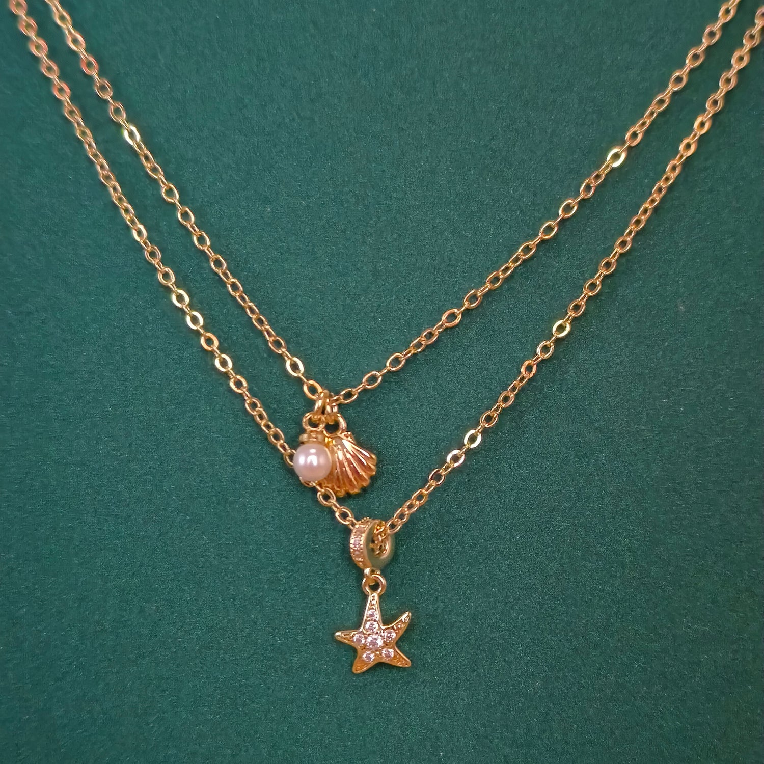 Add a touch of seaside charm to your look with this elegant layered necklace. Featuring two delicate gold chains, the upper layer is adorned with a dainty shell and pearl charm, while the lower layer showcases a sparkling starfish pendant embellished with tiny crystals. Perfect for summer styling or gifting to ocean lovers.