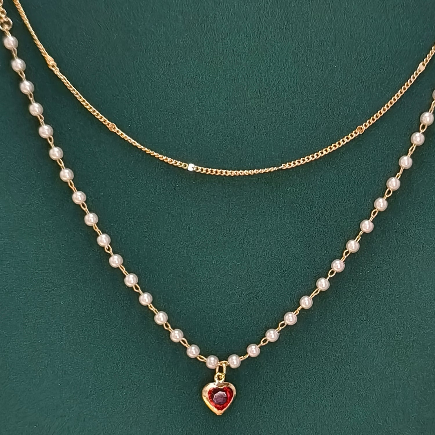 Dual Chain Heart Pendant Necklace with Pearls Gold Plated