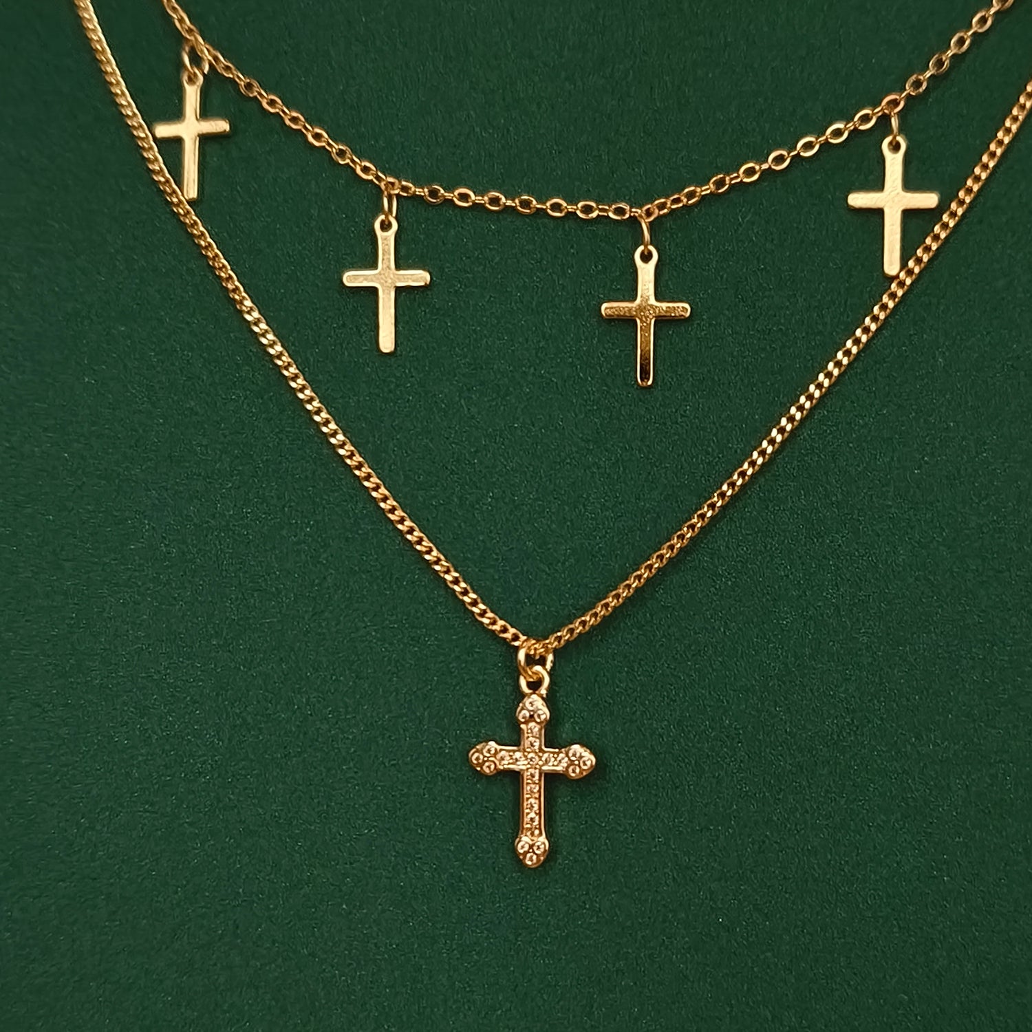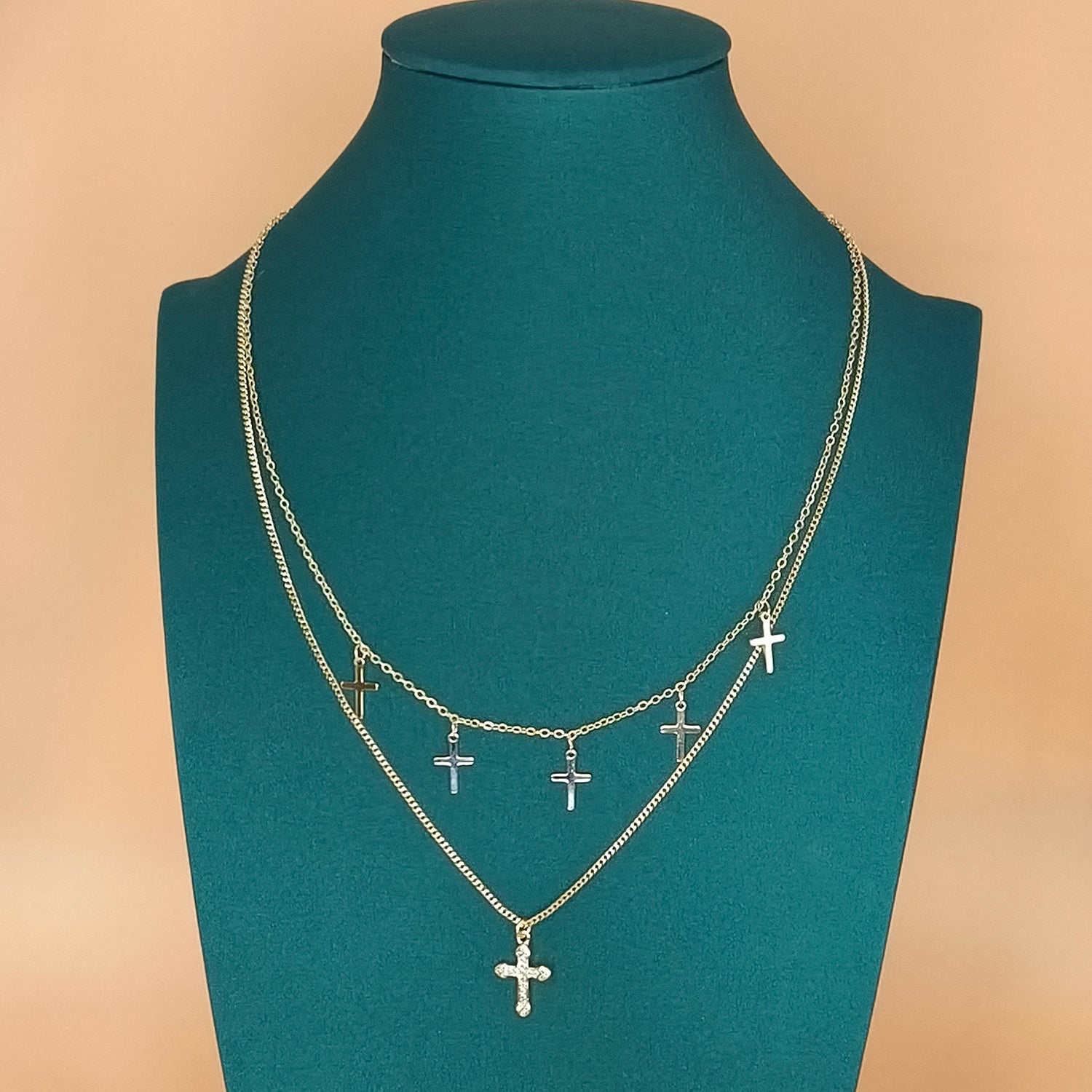 Layered dual Chain Multi Cross Pendant Necklace Gold Plated