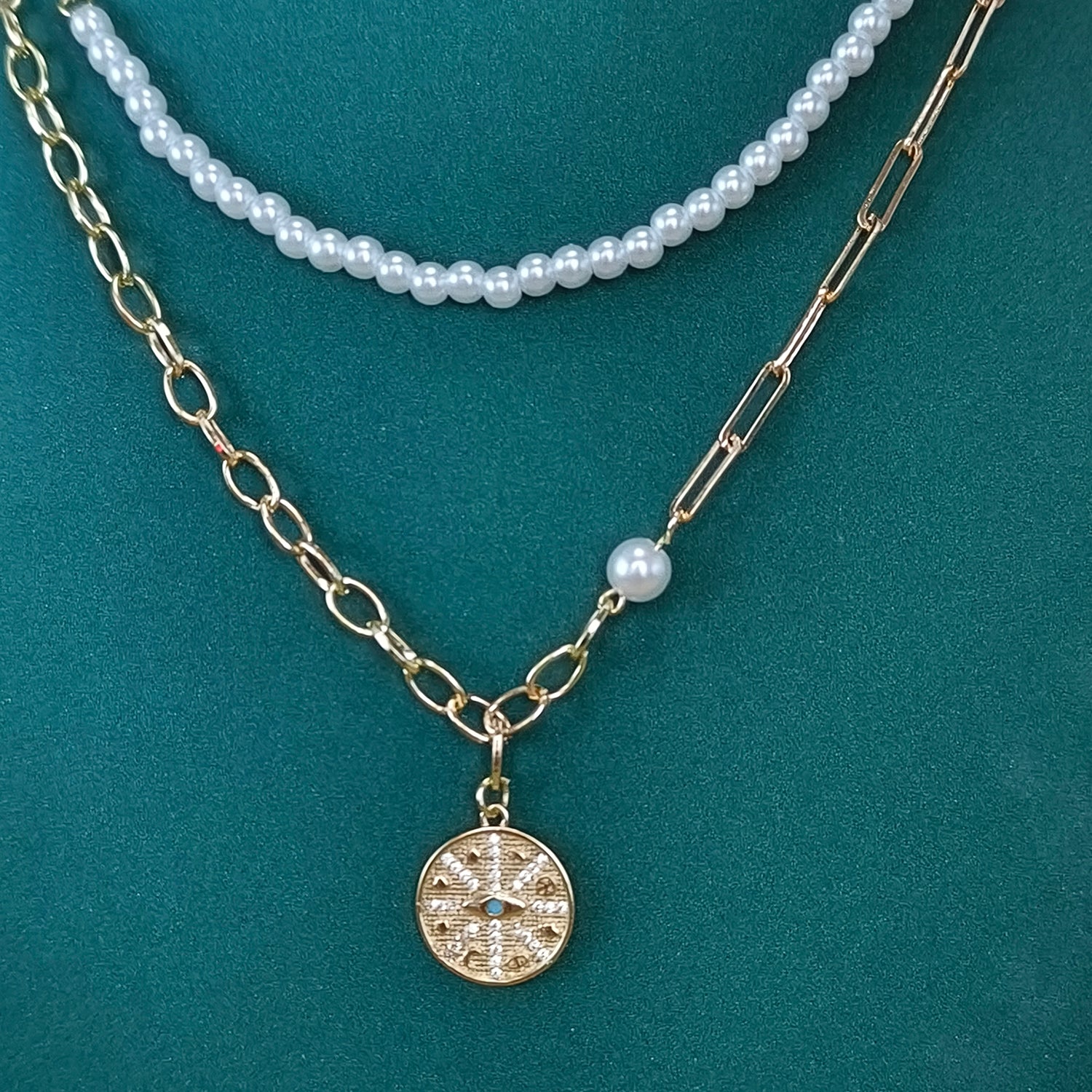 This chic layered necklace blends classic elegance with modern edge. It features three distinct strands: a string of glossy white pearls, a sleek gold paperclip chain with a single pearl accent, and a bold textured link chain holding a round vintage-style medallion pendant. A versatile statement piece perfect for elevating both casual and dressy looks.