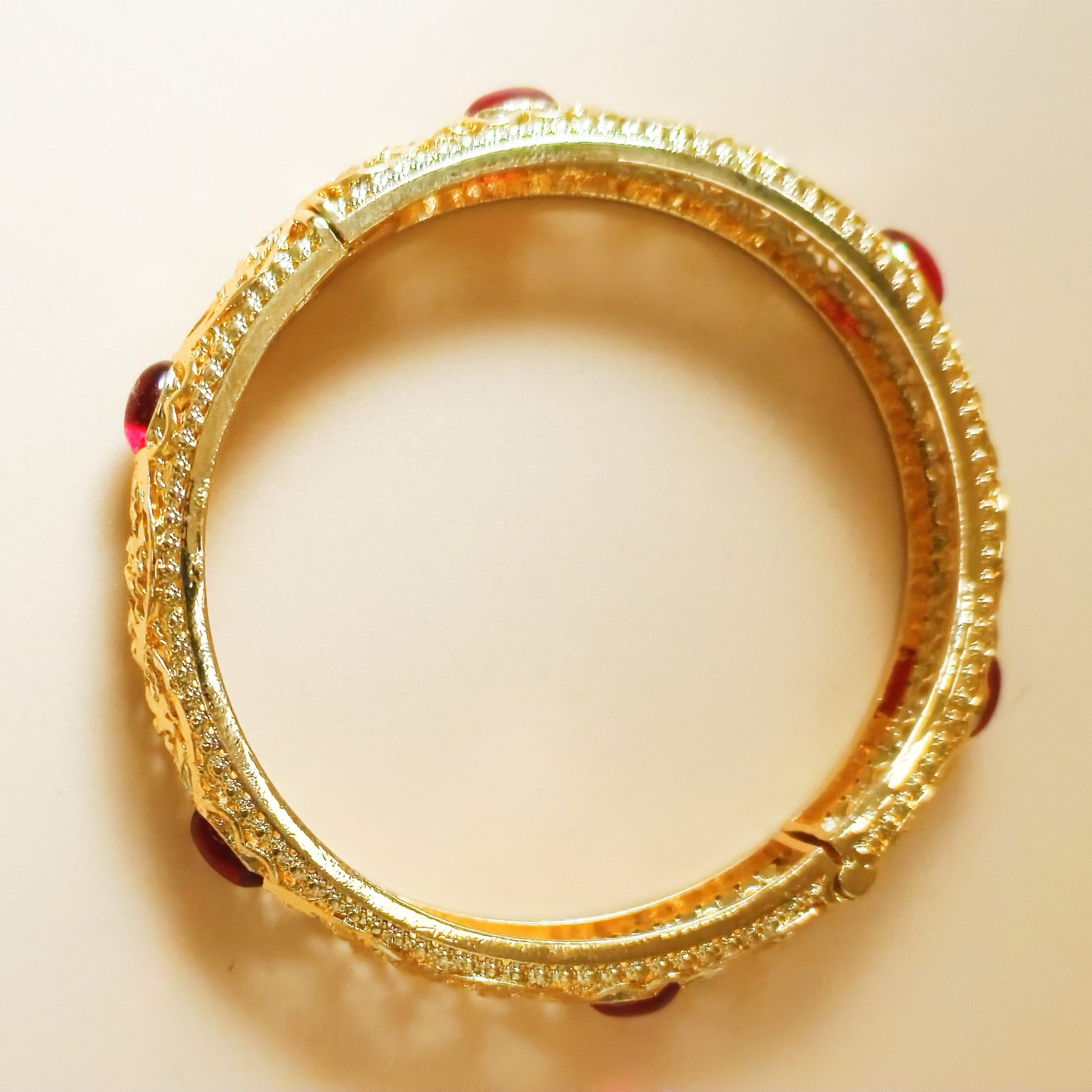 This elegant gold bangle features intricate filigree detailing and is adorned with rich ruby like red stones, blending classic craftsmanship with timeless sophistication.