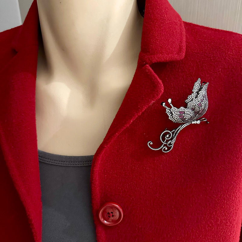 Elegant butterfly brooch crafted from copper alloy with cubic zirconia and rhodium plating. Featuring blue and silver crystal details, it measures 7.5 × 4.9 cm and weighs 15.26 g. A refined accessory to add sparkle to coats, dresses, or scarves.