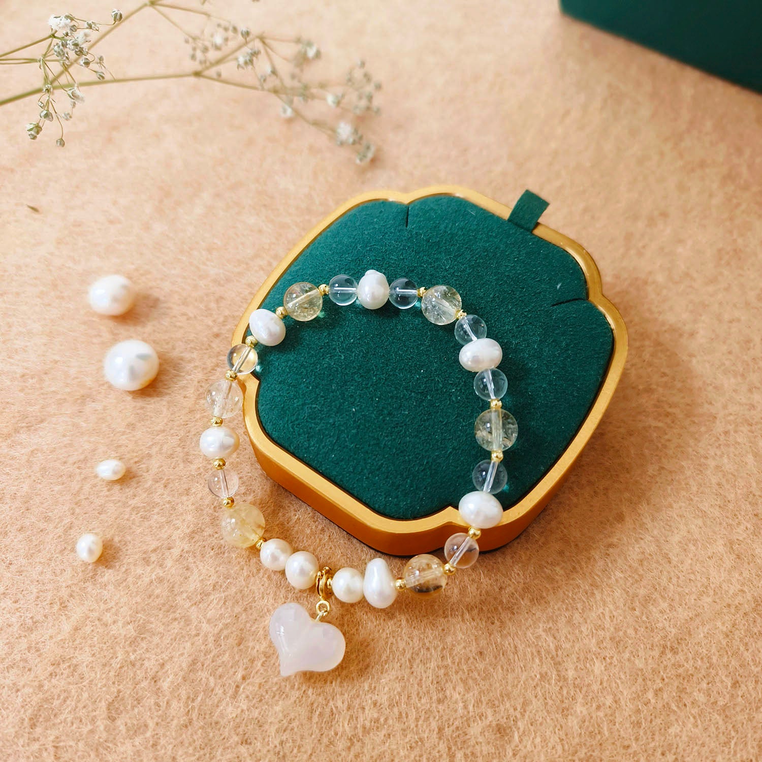 Freshwater pearls, crystal beads, glass heart charm, gold-tone alloy, elastic cord