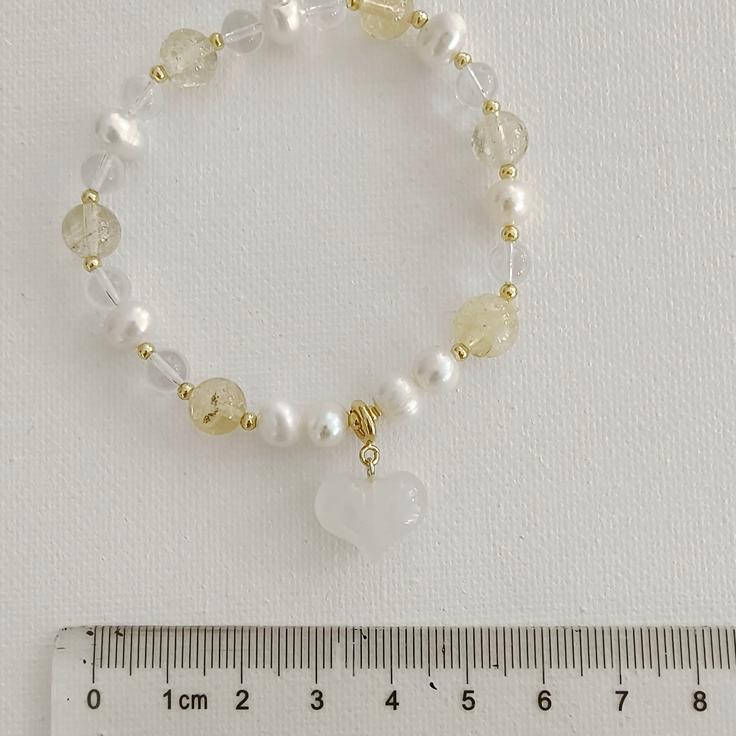 Delicate bracelet featuring freshwater pearls, clear crystal beads, soft yellow crystal accents, and a milky heart-shaped charm. Finished with gold-tone spacer beads and stretch cord for comfortable everyday wear.