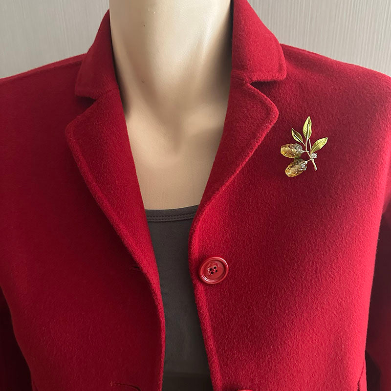 Inspired by the quiet elegance of olive branches, this brooch showcases two beautifully carved translucent green fruits paired with hand-painted enamel leaves. A sparkling crystal accents the natural composition, adding a subtle touch of refined brilliance.