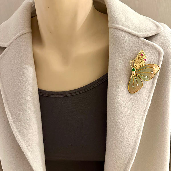 Elegant butterfly brooch with filigree wing, pearl accents, and gemstone details. A unique accessory for jackets, scarves, or dresses — perfect gift for women and jewelry lovers.