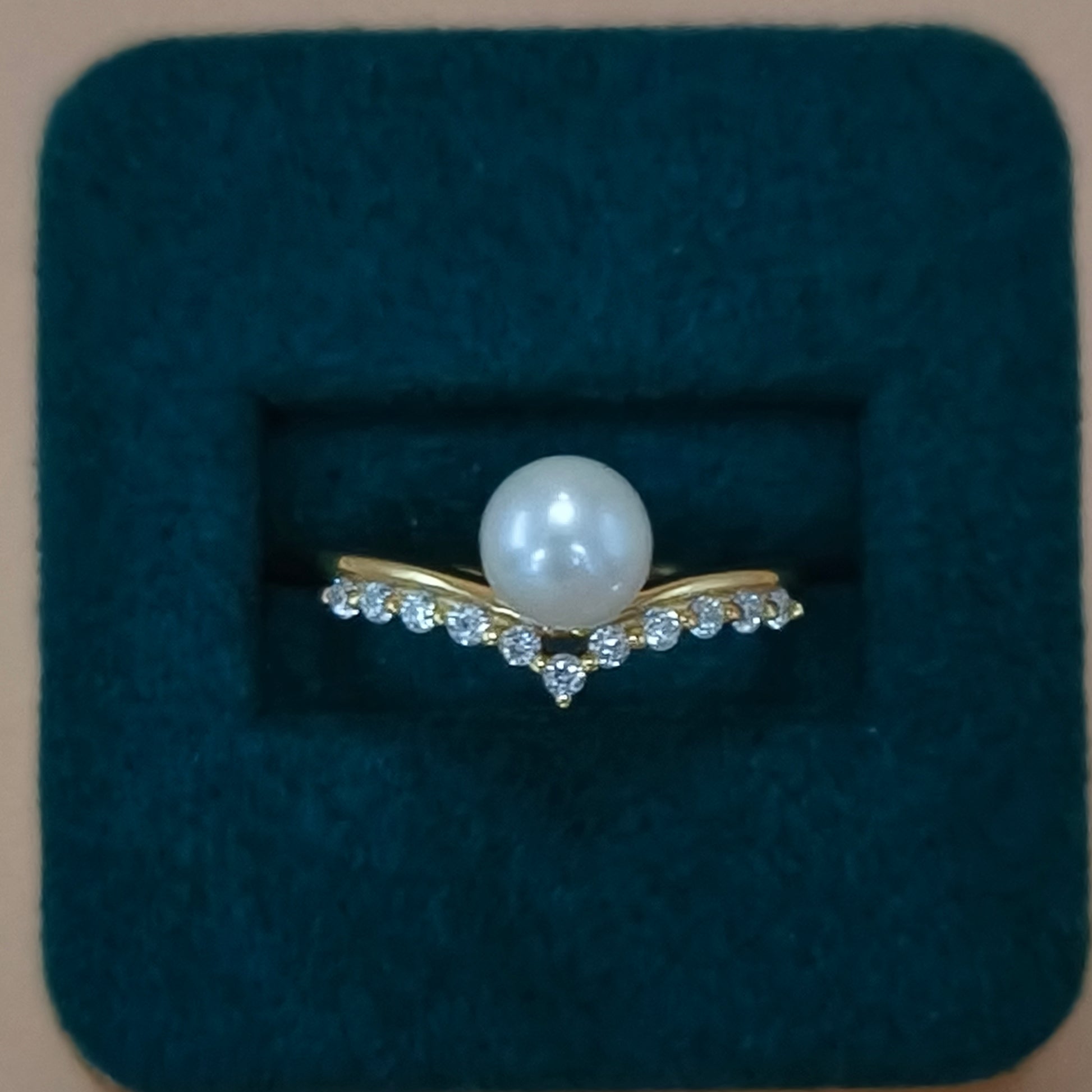 The Pearl Crown Radiance Ring brings a touch of royalty to every moment. Its centre features a smooth, radiant pearl resting above a beautifully sculpted V-shaped crown of shimmering crystals. The delicate gold-tone band enhances the luxurious design, making this ring a perfect choice for special occasions, romantic gestures, or adding everyday elegance to your style.